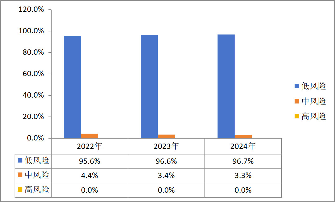 2024年,我公司高風(fēng)險(xiǎn)供應(yīng)商0,中風(fēng)險(xiǎn)供應(yīng)商占比為3.3%,低風(fēng)險(xiǎn)供應(yīng)商占比為96.7%,中/高風(fēng)險(xiǎn)供應(yīng)商審核率為100%。根據(jù)近三年供應(yīng)商風(fēng)險(xiǎn)評(píng)估數(shù)據(jù)顯示,我公司低風(fēng)險(xiǎn)等級(jí)供應(yīng)商數(shù)量占比呈現(xiàn)持續(xù)優(yōu)化態(tài)勢(shì),供應(yīng)鏈風(fēng)險(xiǎn)管理水平顯著提升。